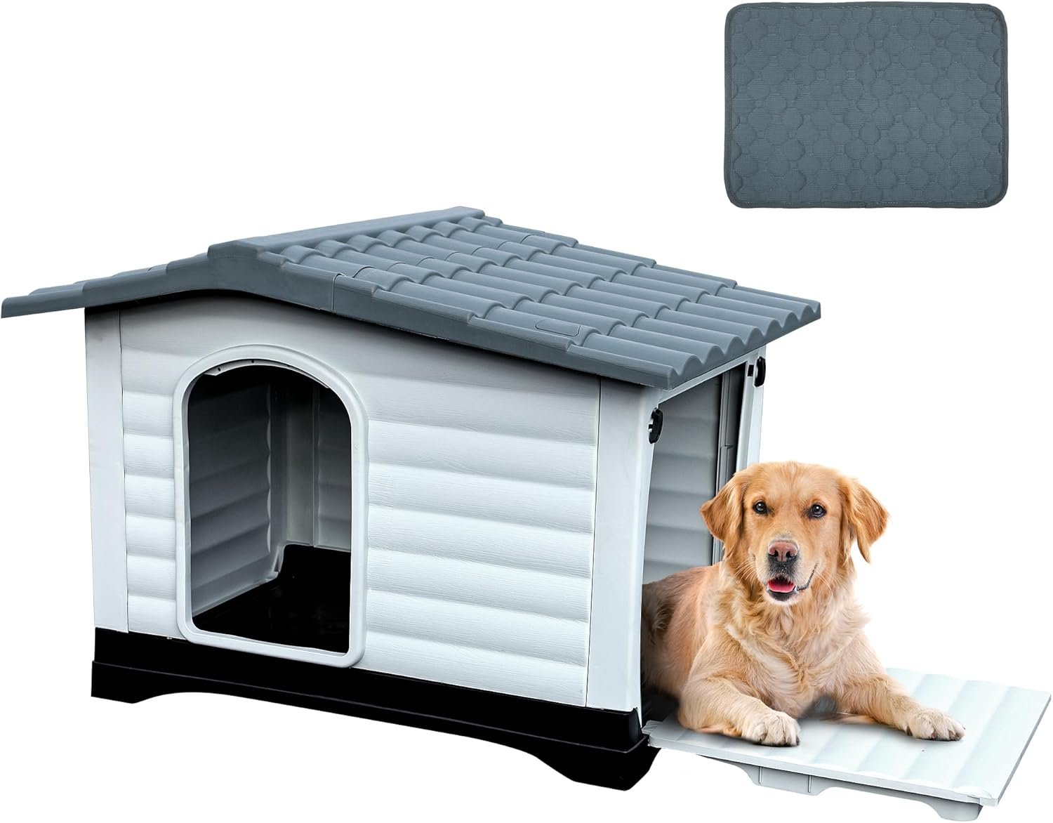 - Spacious 2-Door Layout: Our plastic dog house features dual doors for optimal ventilation; The open side door creates a roomy terrace, ideal for summer cooling; Close it for added warmth in winter; Easy access for cleaning and pets