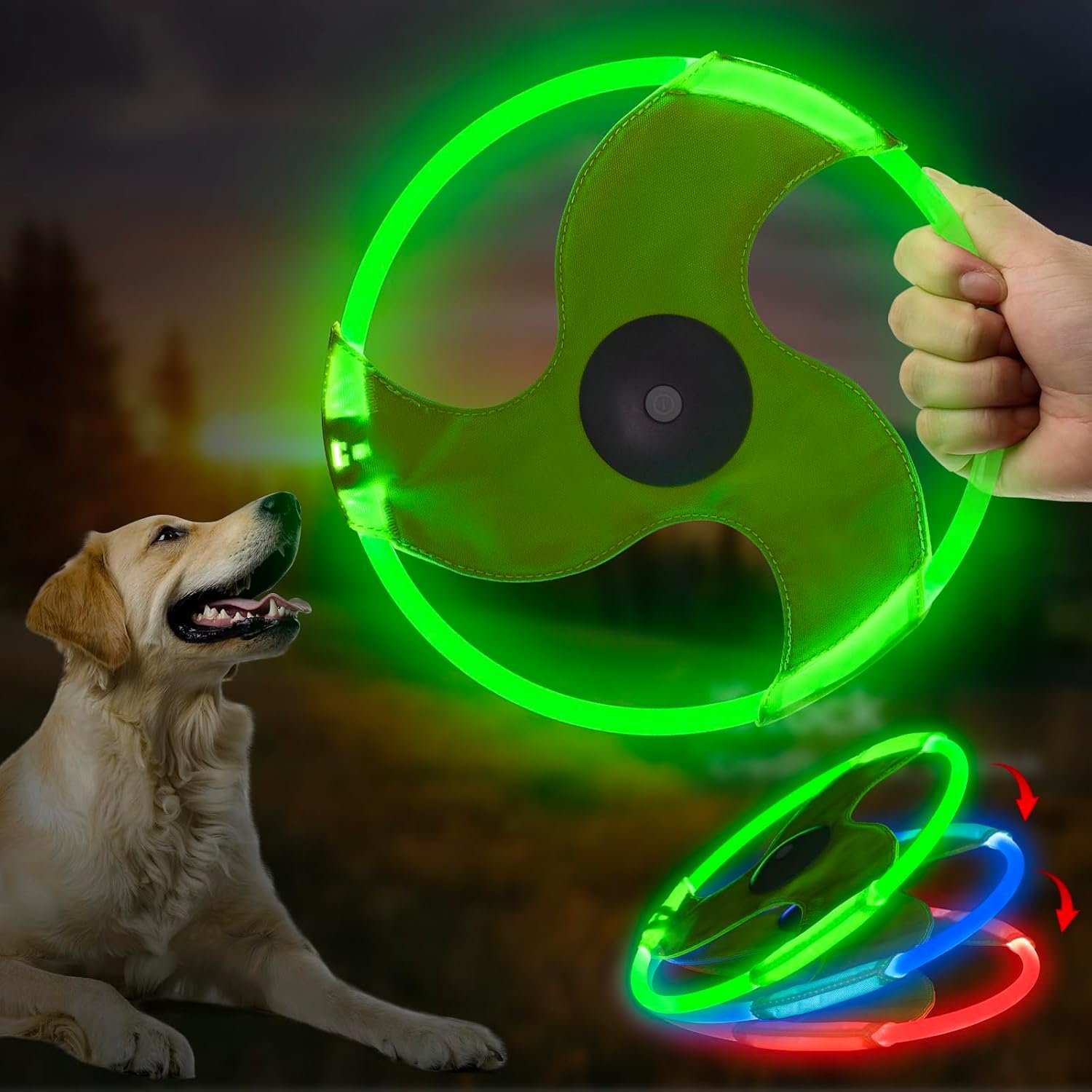 - 【3 Mode Lighting: Green, Red, Blue】LED Flying Disc Dog with vibrant colors for nighttime fun. With three light modes—green, red, and blue—it’s easy to spot from afar. A quick 1.5-hour charge offers up to 5-8 hours of glow time, ensuring playtime stretches well into the evening